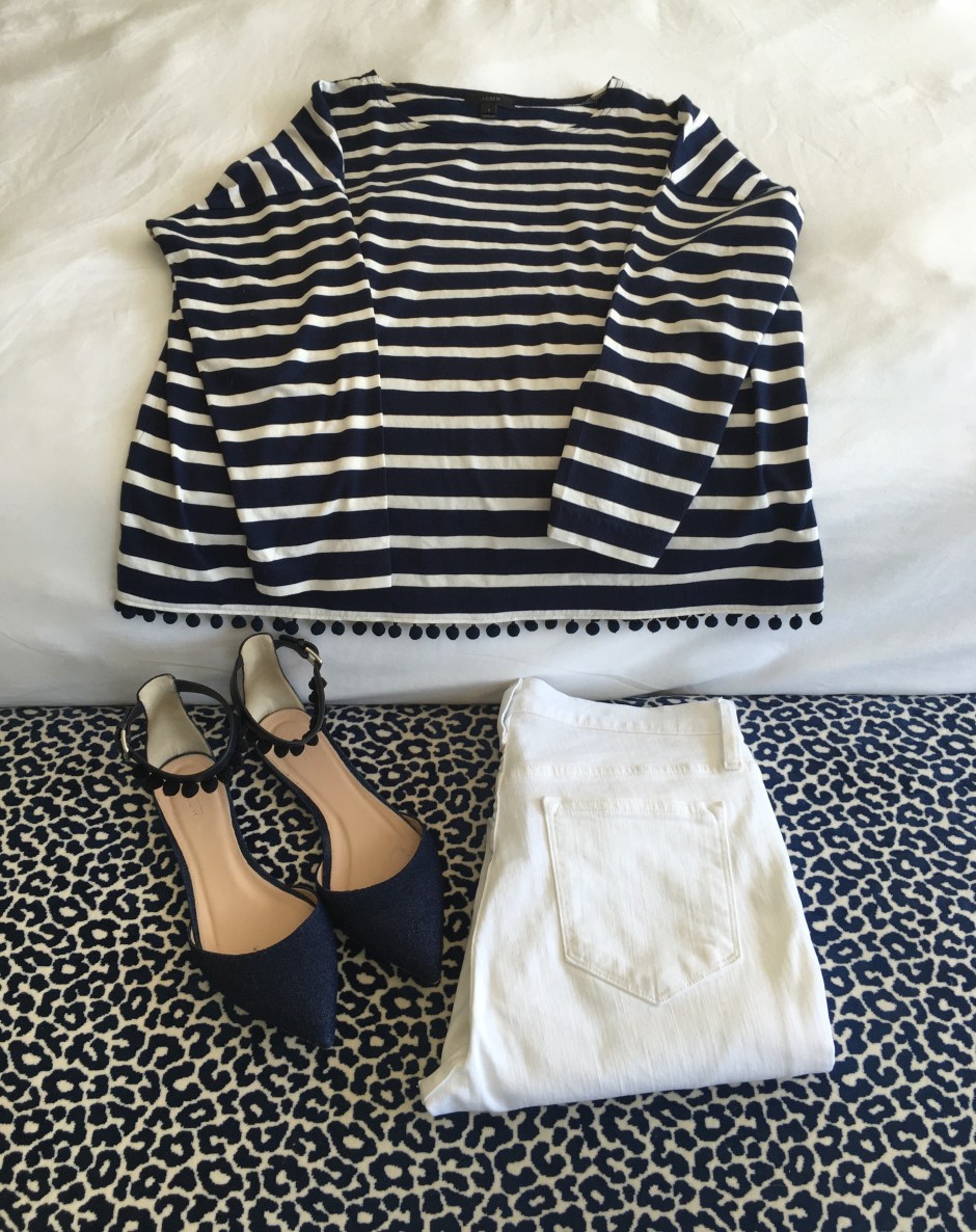 I was lucky enough to grab the pom-pom shoes from J. Crew when they first came out (they were online only). I have seen them pop up a couple of times in the sale section. It may be worth a little sale stalking. I was wearing them last week and saw the long sleeve tee. The shoes insisted I buy it. I am styling the shoes and pom-pom striped tee with my cropped high rise lookout white jeans from J.Crew to show off the pom-poms as well as pair of lavender AG jeans that are on sale at Calypso