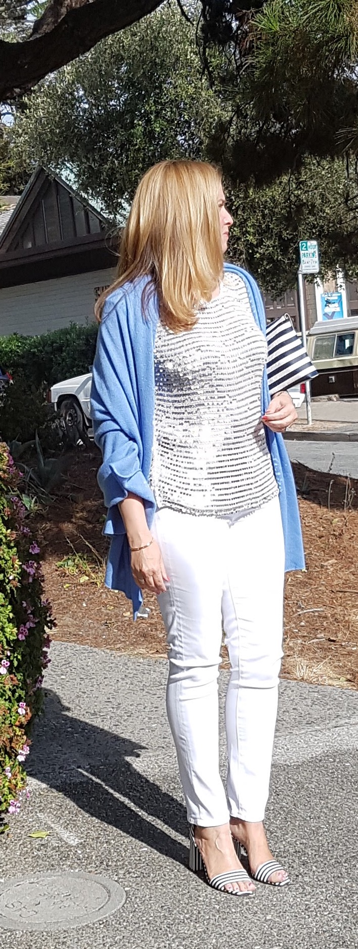 As excited as I was to go, I still had some last minute packing and outfit selection anxiety. I decided to go with my favorite white jeans, a fabulous sequined top that is on sale at Calypso, and my striped heels and clutch from J.Crew. One of my classmates commented that I was the preppiest person they have ever known, so J. Crew stripes for evening wear was no surprise.
