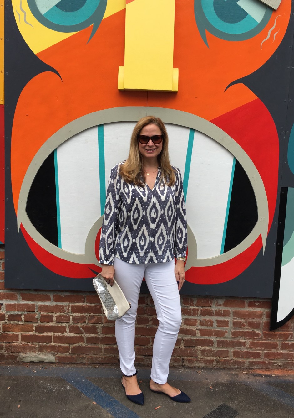 There are so many pretty and inspiring walls in Venice. My mom and I found a bunch of cool ones a few weeks ago. I featured this J. Crew Ikat blouse in my Ikat in the Dining Room post. I decided it needed to be shown outside with white denim. These were such fun backdrops and I added a Parker Thatch sequined clutch.