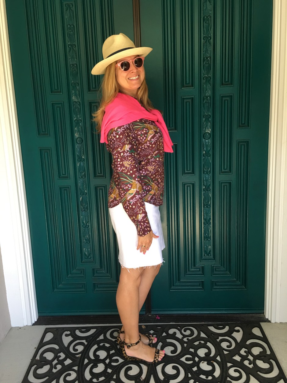 I love seeing fall clothes in the stores, but it is still summer. We are enjoying the last week of summer with a getaway and lots of beach time. J. Crew’s recent roll out with all the pink is amazing. The Drake’s prints are so beautiful. You can read more about their history and the process here. I continue to enjoy the challenge to wear pink. I love this Drake’s shirt with pops of pink in the cardigan and my new J. Crew Jane sunglasses. The white denim pencil skirt still makes it feel summery.