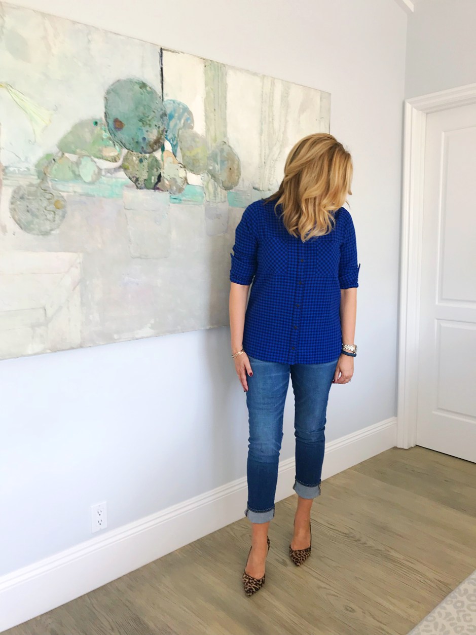 I am breaking out the light flannel now that LA’s heat wave has broken and the temperatures are finally down in the double digits. I love this mini buffalo check in blue from J. Crew. I styled it with high rise (11 inch!) slim boy jeans from Madewell and my leopard pumps.