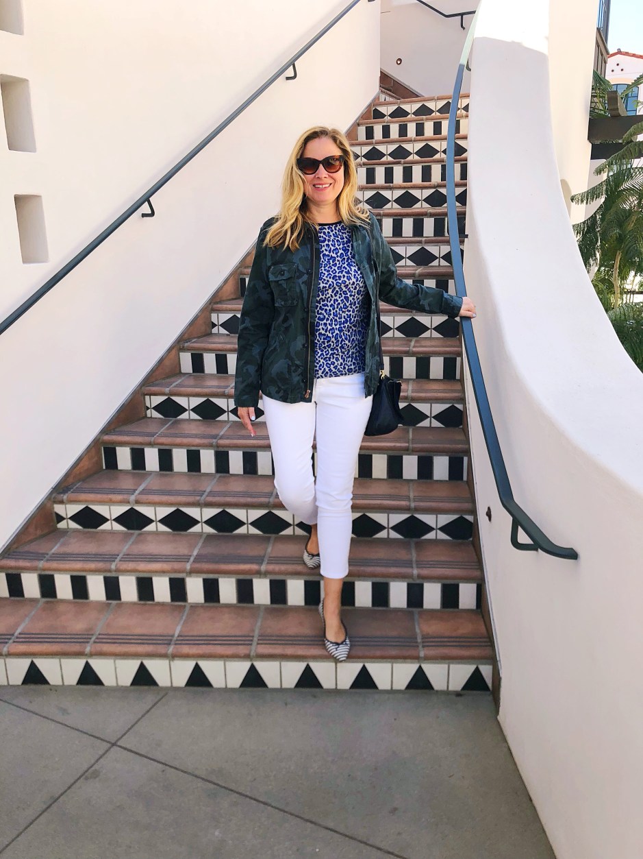 For a recent lunch in La Jolla, I styled the top with white denim, my Ark bag, sunglasses and denim slides.